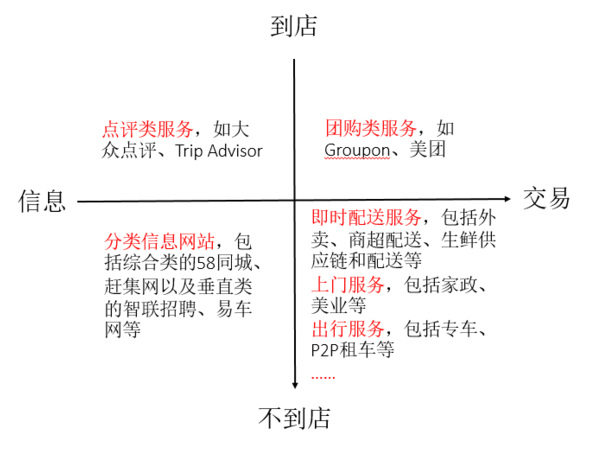 在O2O生态中,业务形态繁多、边界几乎可以无限延伸。但若对各类O2O服务进行业务逻辑上的拆解,几乎所有的O2O业务都可以按照“做信息还是做交易”、“到店服务还是不到店服务”两大维度放入以下四个象限中(如下图):