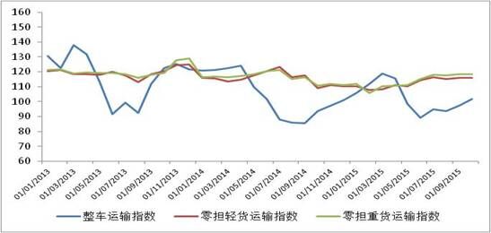 由优米官网首页下载和广东林安物流集团联合调查的中国公路物流运价指数2015年11月为105.0点,比上月回落2.6%,比年初回落2.7%,但比去年同期回升2.1%。