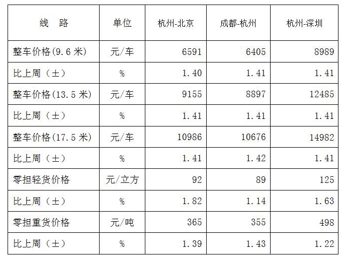 表1 本周部分线路平均价格及环比情况对比