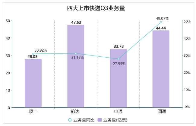 根据中国邮政局公布的《关于2018年前三季度邮政行业经济运行环境的传递》,2018年前三季度,全国快递营业量完成347.4亿件,同比增加26.8%;快递营业收入实现4246.3亿元,同比增加24%。顺丰、韵达、圆通、申通四大快递股前三季度合计实现营业量153.88亿件,占全国总营业量的44.3%。