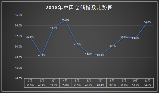 点评:从2018年的中国仓储指数、物流景气指数数据表现来看,1至4月份业务活动保持了较为明显的增长态势,其中2月份指数落入收缩区间,主要受春节因素影响,但随着节后生产经营活动的恢复,至4月份,都处于扩张区间的高位水平。但经历了高峰后连续多月都有明显的滑坡,主要受高温多雨的季节性回落影响。8月起随着营商环境改善,“金九银十”及中秋国庆、双十一等节点影响,传统旺季来临,连续四个月保持在扩张区间,仓储物流行业整体运行良好,短期内的需求预期仍较为乐观。
