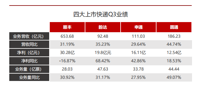 点评:通达系营收净利“双增”,且增速保持在18.53%-129%之间。顺丰净利润首次下滑,但从营收规模来看,不论是Q3单季还是前三季度顺丰均超其他三家营收总额。整体来看,全行业继续保持中高速增长,增长态势稳中趋缓,在关联产业的各个部门中,快递增速继续保持领先。快件量月度间差异呈现收缩态势,淡旺季特征趋于淡化,月度间流量更趋均衡。