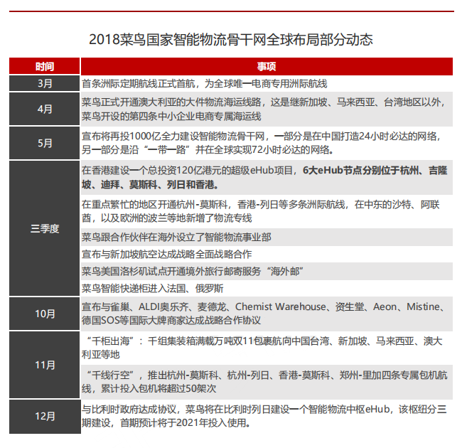 今年5月,马云宣布将投资上千亿打造全球智能物流骨干网。目前,菜鸟已在杭州、香港、吉隆坡、迪拜、列日、莫斯科等城市设立首批6个eHub(电子商务枢纽),截至2018年12月,菜鸟eWTP已落地马来西亚、卢旺达、比利时三站,菜鸟全球布局效应明显。