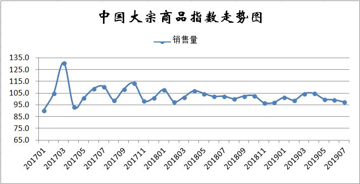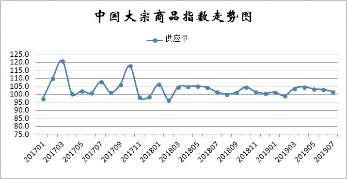 2019年7月份,大宗商品供应指数为101.7%,指数三连跌至近五个月以来的低点。数据显示,7月份以来,由于高温多雨、环保停限产政策以及部分商品生产利润下滑,国内大宗商品生产增速整体趋缓,部分订单延后生产,商品供应增速持续回落。从各主要商品来看,因不同产业所受环保政策以及生产利润不同的影响,各品种生产厂家开工率略有不同,导致各商品供应量增减出现明显分化。本月钢铁、成品油和化工供应量明显减少,但汽车供应量止跌回升,铁矿石、原煤和有色金属供应量继续增加。