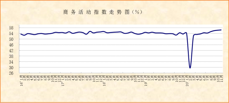 制造业稳中有进,带动流通环节趋于活跃。批发业商务活动指数连续3个月环比上升,本月升至55%以上,创年内新高;新订单指数连续3个月稳定在52%左右。指数变化表明,随着经济的持续较快复苏,流通环节趋于活跃。批发业供需的持续较快增长与制造业的稳中有进密不可分。11月,制造业采购量指数较上月上升0.6个百分点至53.7%,连续3个月稳定在53%以上。