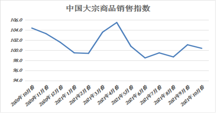 2021年10月份,大宗商品销售指数为100.4%,较上月回落0.7个百分点。本月为传统旺季,但终端需求增速回落,显示市场旺季不旺,不及预期。近期国内电力、煤炭等能源价格较快上涨,也在提高企业的原材料采购和生产成本,抑制需求,加之月内多地疫情反弹又进一步影响了市场需求,终端企业采购越发趋于谨慎,市场订货积极性明显降低,成交明显减弱,商品生产企业订单组织压力加大。各主要商品中,钢铁、铁矿石销售量较上月有所减少,化工和汽车销售量虽较上月有所增加,但增速放缓,煤炭、成品油和有色金属销售量继续增加,且增速加快。