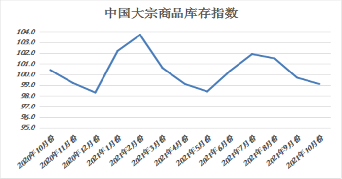 2021年10月份,大宗商品库存指数为99.1%,指数较上月回落0.6个百分点,为五个月以来的最低,显示虽市场需求增速减缓,但供应端持续减弱,令商品库存继续下降。各主要商品中,钢铁、成品油和有色金属库存量较上月有所减少,化工库存量继续增加,但增速减缓,铁矿石库存量增速加快,煤炭和汽车库存量则止跌回升。