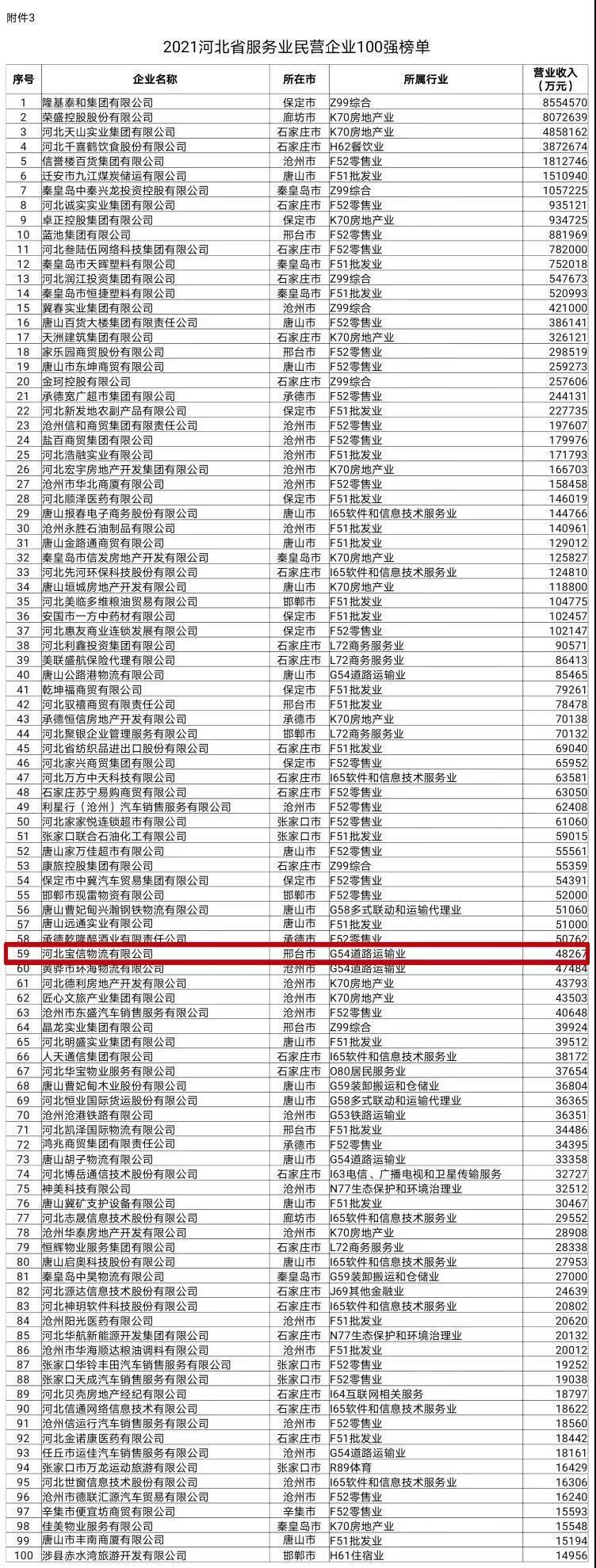 2021年8月10日,河北省深化“放管服”改革暨推动民营经济发展工作会议在石家庄市召开,省委书记、省人大常委会主任王东峰在会议上做出重要讲话,省委副书记、省长许勤主持会议,省政协主席叶冬松出席会议。会议上公布了“2021河北省民营企业100强、制造业民营企业100强、服务业民营企业100强”榜单,宝信物流和今麦郎、家乐园等企业纷纷荣耀登榜,宝信物流位列服务业民营企业100强第59位。