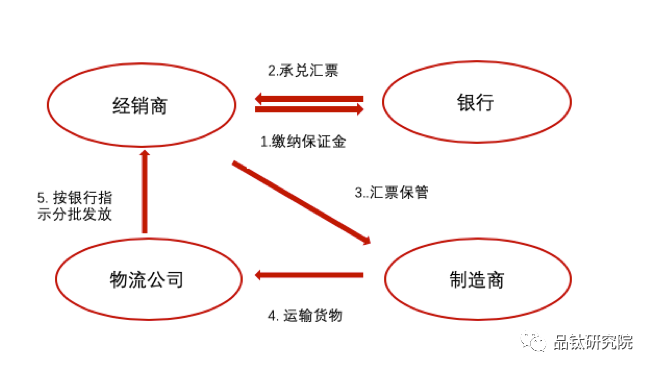保税仓模式——作为仓单质押模式的延伸,保税仓模式主要涉及经销商、制造商、银行、物流供应商四个主体,四方签订保税仓业务合作协议,也就是通常所说的先有票再有货的模式。主要包含以下三个步骤:
