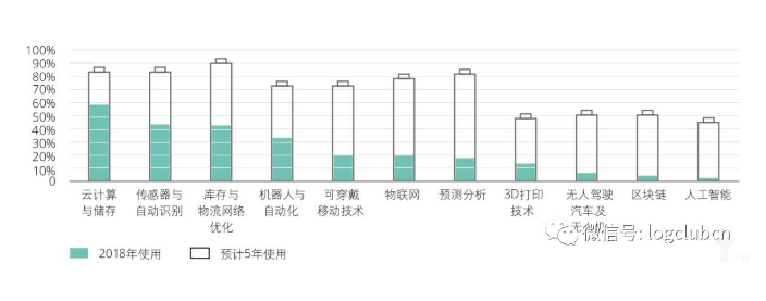 如今,大数据、云计算、自动化等技术开始在物流行业落地应用,但福佑卡车创始人兼CEO单丹丹曾在采访中表示,当前AI技术在物流业的应用还不足5%。2019年6月,知名咨询公司德勤也发布报告指出,2018年AI、无人驾驶技术在物流行业的采用率不足10%,预计在未来5年的使用率可以达到45%-50%。2018年物联网技术的采用率约20%,在5G等技术的推动下,未来5年使用率将接近80%。