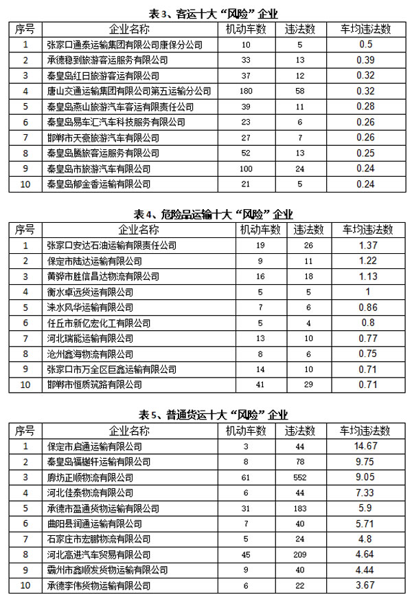 日前,河北省公安厅交通管理局对9月份全省道路运输企业违法和交通事故情况做了梳理统计,分别统计出全省“十佳”和“风险”企业道路运输企业,提醒广大运输企业落实好交通安全管理措施,主动预防交通事故,减少交通违法。