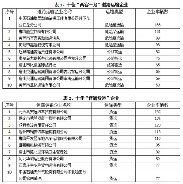 “两客一危”和普通货运“十佳”运输企业分别是: