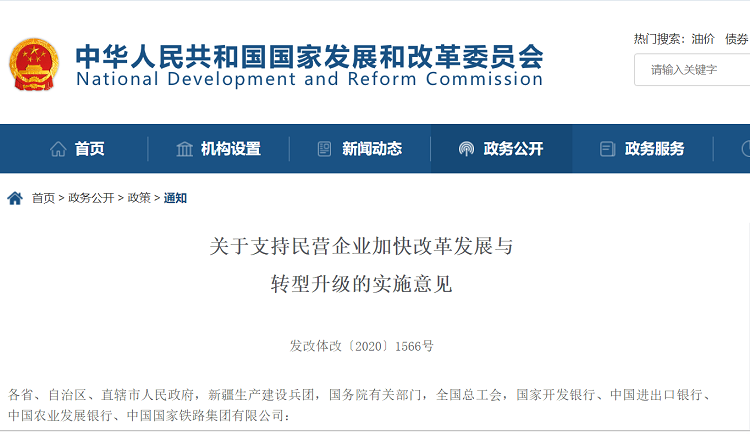 近日,万联网记者注意到,国家发展改革委、科技部、工信部等六部门于10月23日联合印发《关于支持民营企业加快改革发展与转型升级的实施意见》(以下简称《意见》),《意见》从切实降低企业生产经营成本、强化科技创新支撑、完善资源要素保障、着力解决融资难等方面提出38条具体举措,旨在有效应对新冠肺炎疫情影响,激发民营企业活力和创造力,进一步为民营企业发展创造公平竞争环境,带动扩大就业。