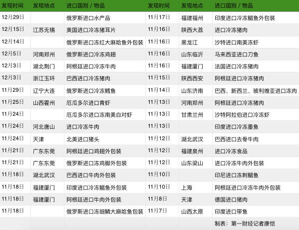 陕西业润供应链有限公司总经理魏帮顺在接受第一财经记者采访时表示,在国际冷链运输的整个链条中,目前异常发现的主要环节在口岸、集散市场及主要存储中心。