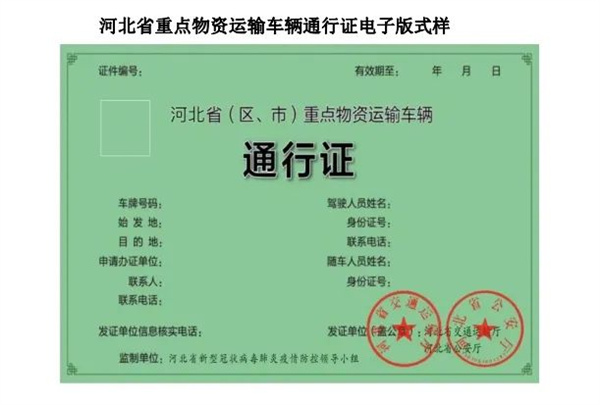 对此,国务院物流保通保畅工作领导小组紧急出台相关政策,决定在全国推行统一式样的通行证。我省相关政策也紧急出台。4月22日,河北省应对新型冠状病毒肺炎疫情工作领导小组交通口岸防疫组发布通告,自今年4月23日0时起,正式启用全国统一式样的重点物资运输车辆电子通行证。