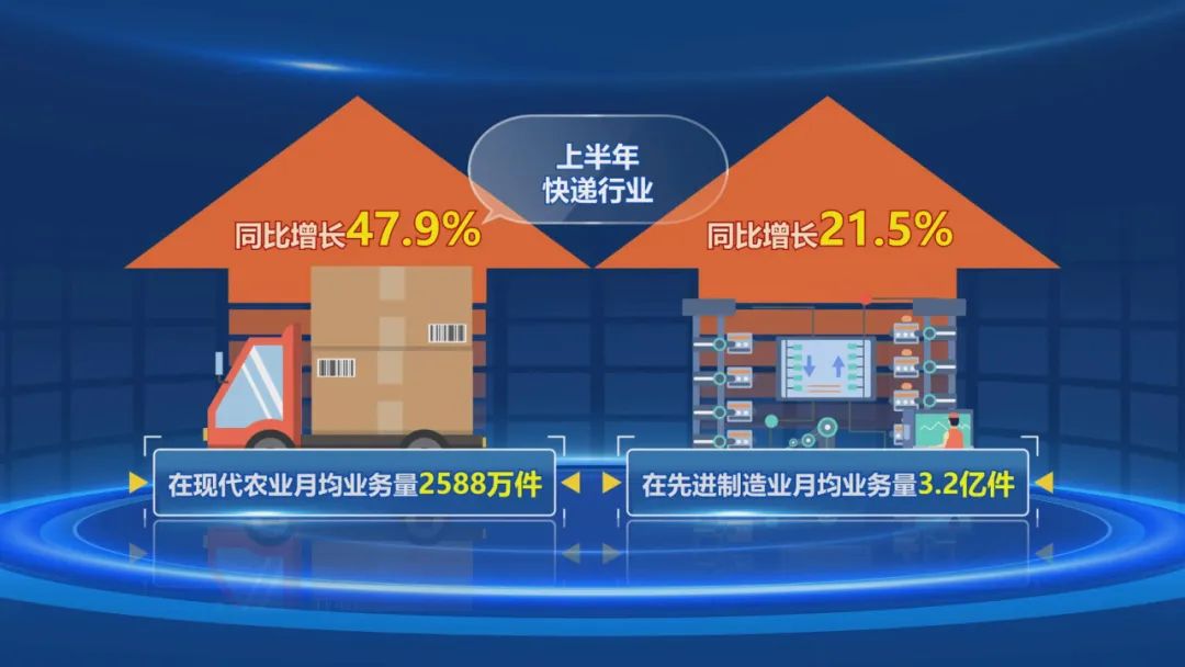上半年,快递行业在我省现代农业、先进制造业两个领域,月均业务量分别达2588万件和3.2亿件,同比分别增长47.9%、21.5%。